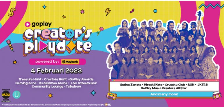 Panduan Membeli Tiket GoPlay Creator’s Playdate – GoPlay Creator’s Playdate merupakan acara berkumpulnya para kreator dari seluruh Indonesia yang diselenggarakan oleh GoPlay Indonesia dan didukung oleh Maybank. Acara ini akan dilaksanakan pada tanggal 4 Februari 2023 di Jakarta dan akan menampilkan penampilan dari musisi terkenal seperti JKT48, SUN, Orutaku Club, Hiroaki Kato, dan masih banyak lagi. Selain itu, terdapat pula berbagai booth yang dapat dinikmati, seperti Live Streaming Box, Gaming Zone, Community Lounge, Itadakimas Arena, dan masih banyak lagi.