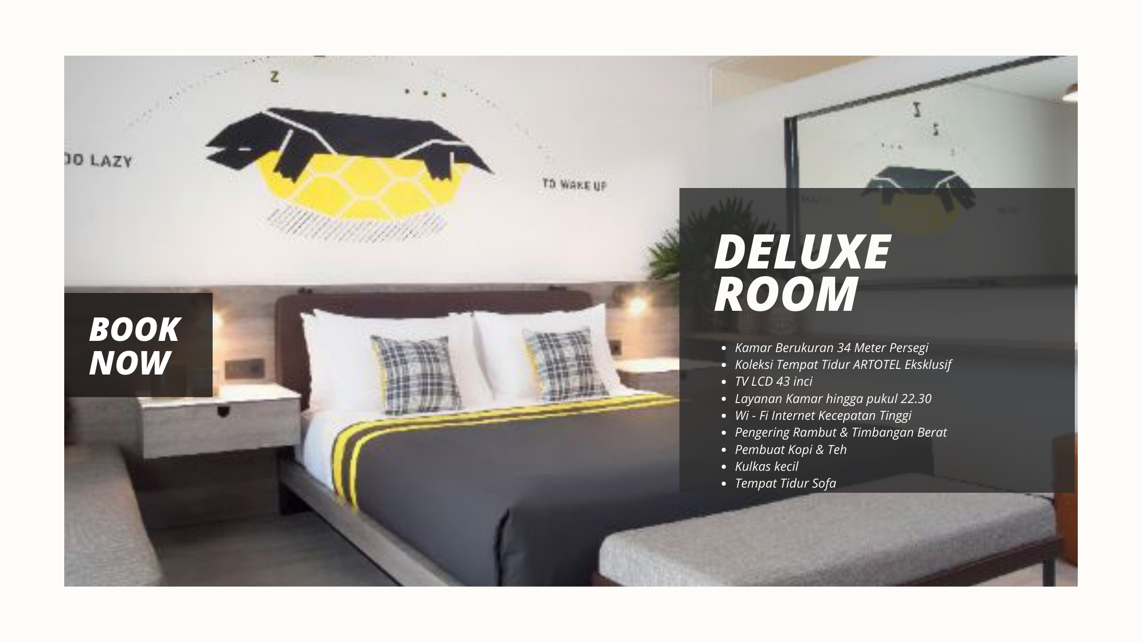Kamar dengan luas 17,5 meter persegi akan kia dapatkan, dan tempat tidur ARTOTEL Ekslusif. Ada TV LCD 43 inci dan pengering rambut. Kita bisa menikmati layanan kamar sampai dengan pukul 22.30 WIB. Tenang, Wi-Fi dengan kecepatan tinggi akan menemani santai kita dalam berselancar.
