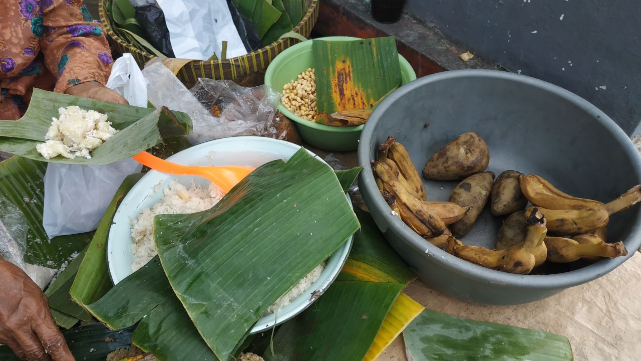 pisang dicampur dengan gula jawa sampai warnanya cokelat. Ada lopis, cucur,