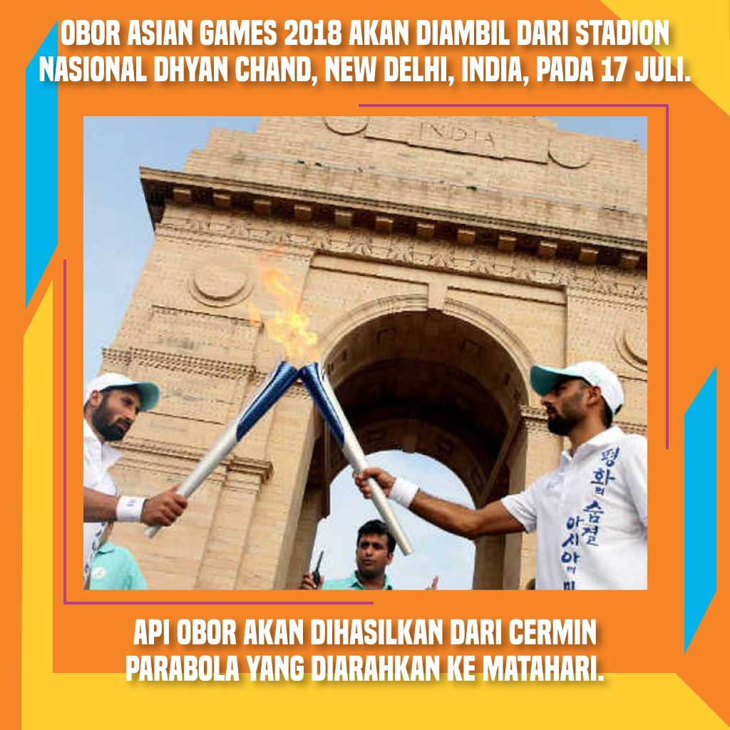 Menariknya desain dari obor Asian Games 2018 ini dipadukan dari 2 unsur, yakni senjata tradisional Indonesia ialah golok Jakarta dan skin Palembang. Sebelum api abadi dari India dibawa ke Indonesia, Susi Susanti sebagai Torch Ambassador Asian Games 2018 dan 30 atlet nasional mengelilingi beberapa wilayah di New Delhi, India. Mulai Stadion Nasional Dhyan Chand ke C-Hexagon lantas ke Amar Jawan Jyoti Road lantas kembali ke stadion yang bersejarah itu.