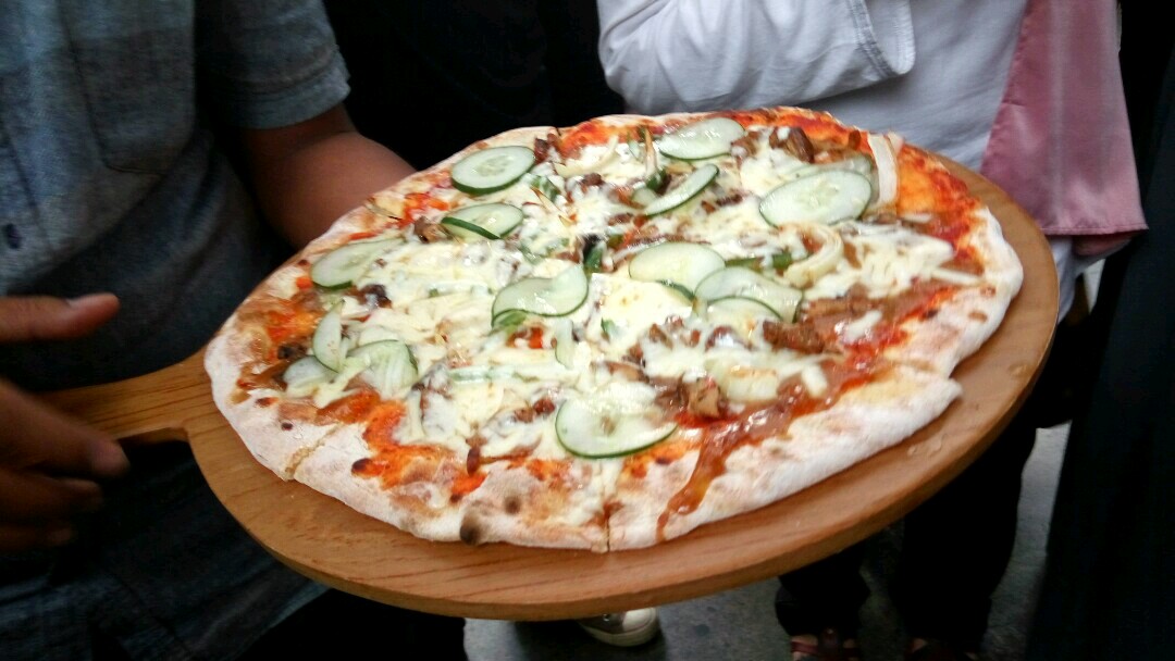 Duck Hoisin Pizza; isi topingnya duck meat, hot hoisin sauce, onion, capsicum dan wonton crackers. Harga Duck Hoisin Pizza ialah Rp 68 ribu.